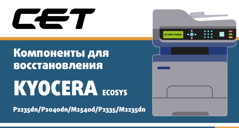 Производитель CET предлагает все необходимые компоненты для самой популярной линейки аппаратов в сегменте монохромной Kyocera A4 формата - Kyocera Ecosys P2235dn/P2040dn/M2040dn/M2540d/ P2335/M2235dn/M2735dn.